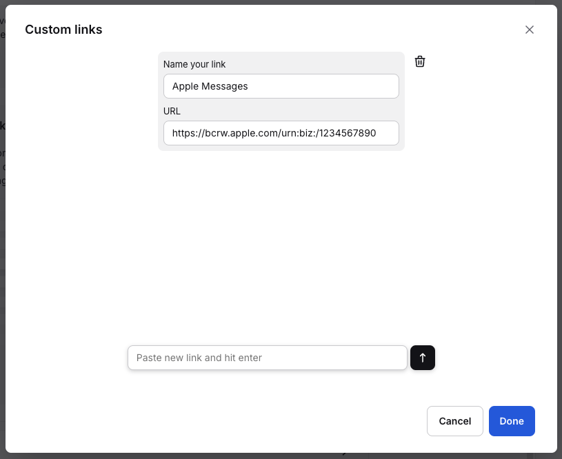 Add a name and your Apple Business ID (received from Apple after registering with Apple Messages for Business) after the last slash on a popup.