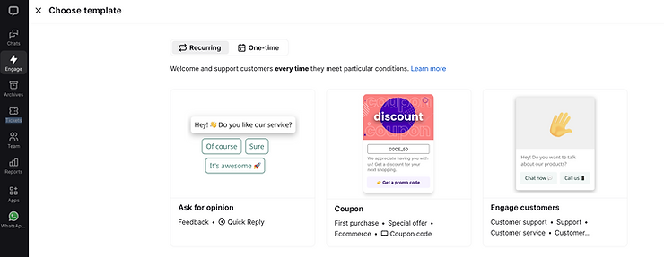 Choose the template that best suits you—for example, Engage customers. This message will appear to visitors before they click the LiveChat icon.