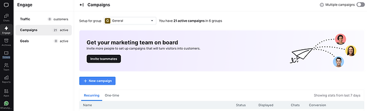 Start by going to the Engage tab, then the Campaigns subtab, and click the New campaign.